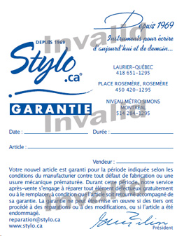 All pens guaranteed by the manufacturers sold by our stores are provided with this guarantee certificate. This is our promise to you: we will take care of your pen if it is defective or shows premature mechanical wear. Our commitment includes everything covered by the manufacturer's warranty. Send your instrument along with a detailed description of the defect and your contact details to the following address: